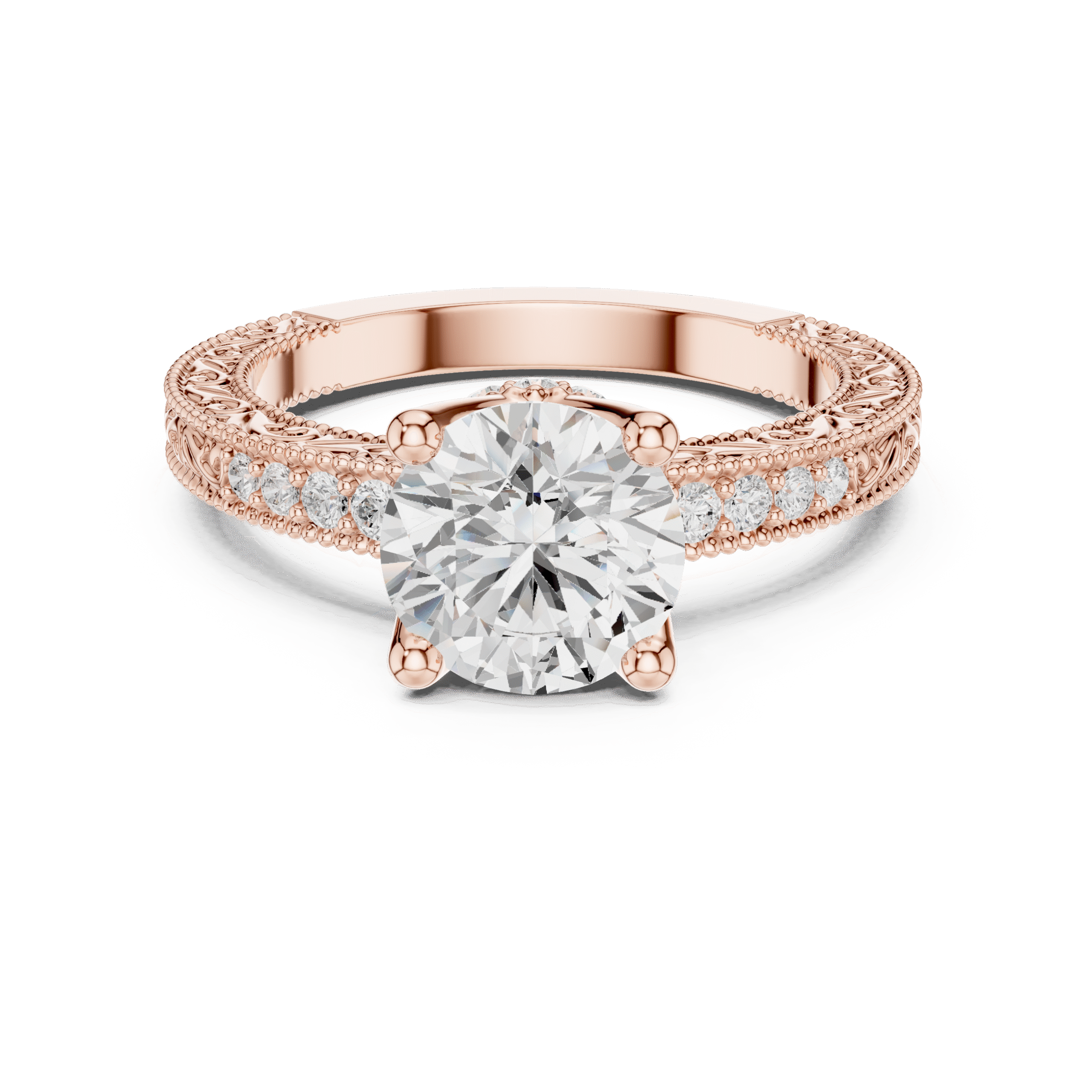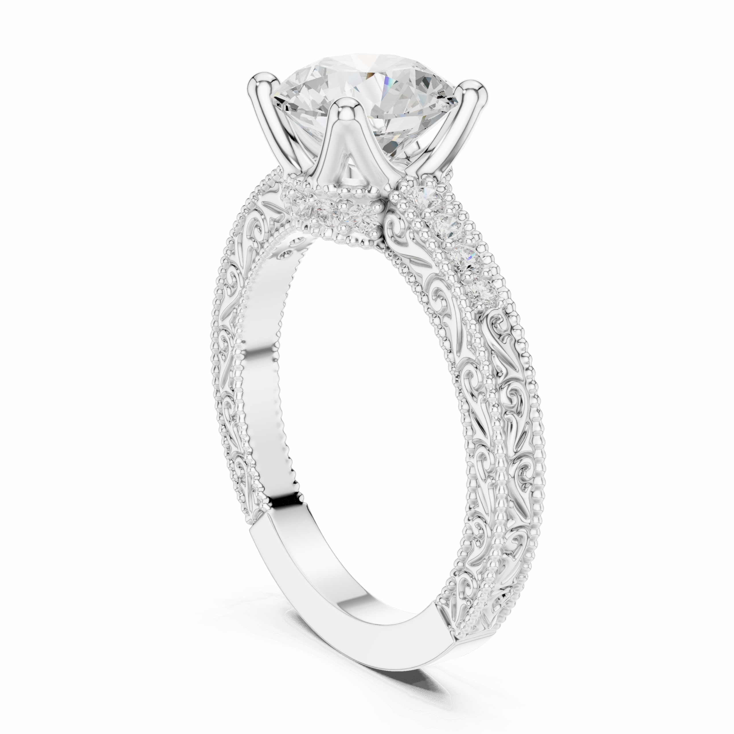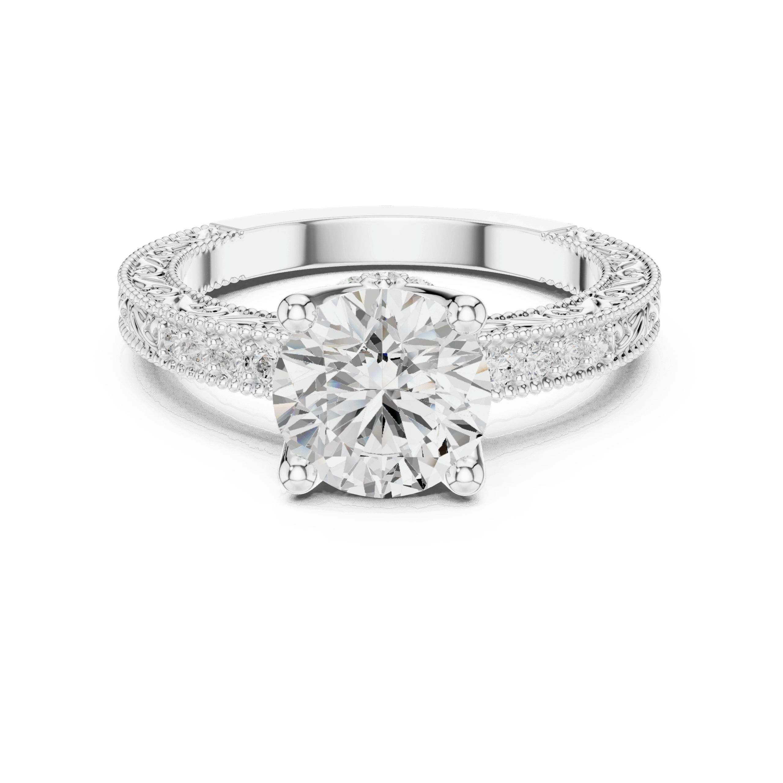 timeless elegance meets ethical craftsmanship in this 2 Carat Round Lab Grown Diamond Vintage Ring, designed for those who appreciate vintage charm and modern values. The centerpiece features a brilliant E color, VVS2 clarity round-cut lab grown diamond, set in a handcrafted antique-style setting.